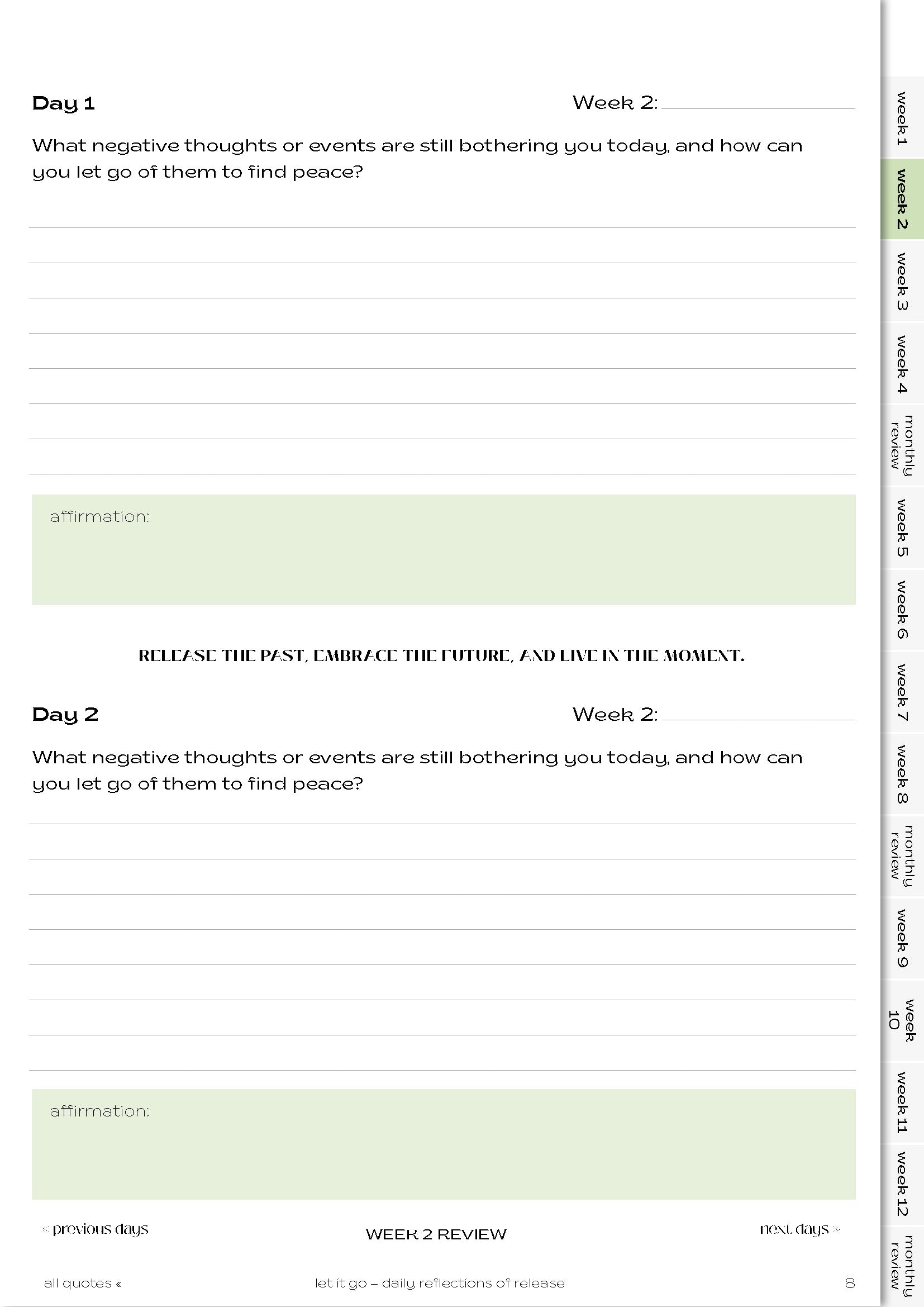 Let go of what no longer serves you and rediscover your peace. Let It Go is a 12-week guided journal designed to help you release stress, process emotions, and reconnect with your calm. With daily prompts, weekly reflections, and monthly check-ins, it gently guides you through your personal growth journey — one page at a time.